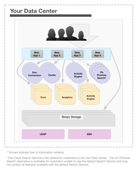 In this configuration, the web application nodes are configured in a cluster and deployed behind a load balancer, preferably an enterprise-grade load balancer, such as the F5 BIG-IP. For more information about how to set up a cluster, see Clustering in Jive). At Jive, we have observed that most customers deploy multiple web applications nodes (usually three or more) in a single data center configuration.
